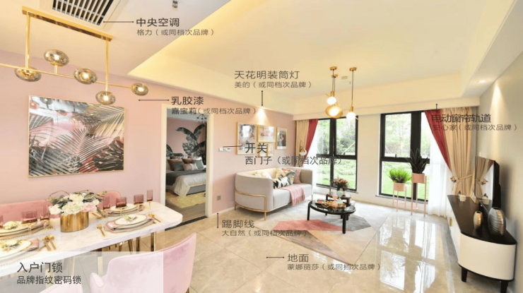 项目配置四大精装科技配置:1、 指纹密码锁;2、 智能马桶; 3、 电动窗帘轨道;4、中央空调(标间为壁挂式),同时装修主材均甄选一线品牌,如:蒙娜丽莎的地砖、大自然的木地板、嘉宝莉的乳胶漆、玉兰的墙纸、西门子的开关面板、摩恩的水龙头等等(或同档次品牌),为业主营造舒适的功能空间。
