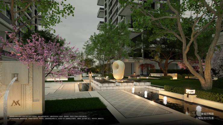顶奢酒店式度假园林:复刻亚特兰大瑞吉经典元素,提取摩洛哥安缦珍纳标志性水轴,奢石与水系融合,营造殿堂级漂浮水苑。