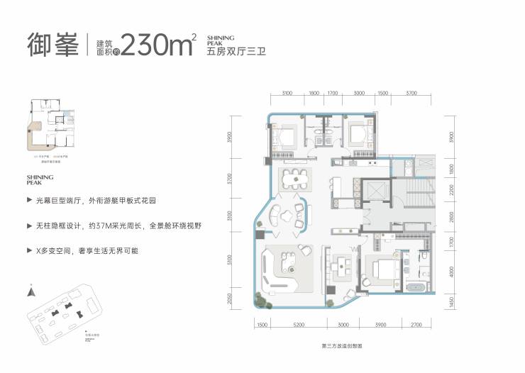 建筑采用大面积双曲面铝板,窗墙比达到 74%,极具地标感。小区中庭以山谷 Shangri-la 为灵感,打造了水瀑、海子、苔地等景观。还设有约 4700㎡的领峯双会所,包括天际私董会・峯云 CLUB 和全龄无界泛会所,提供多种高端生活奢享。