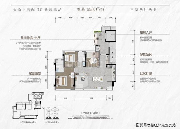 建面约105平套三
