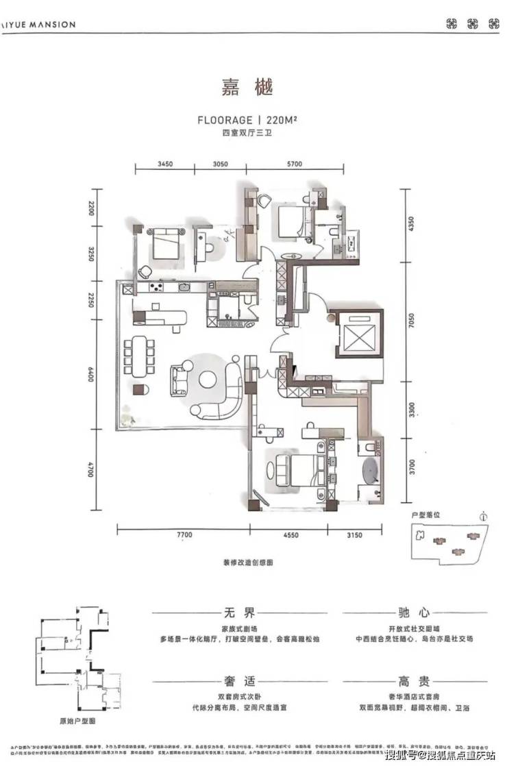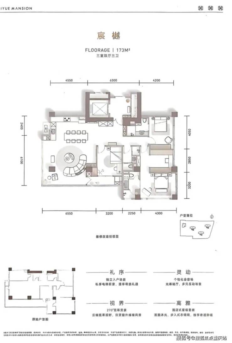 关于户型,天际大平层约173-184-220㎡,顶奢空中跃层约240-560㎡。