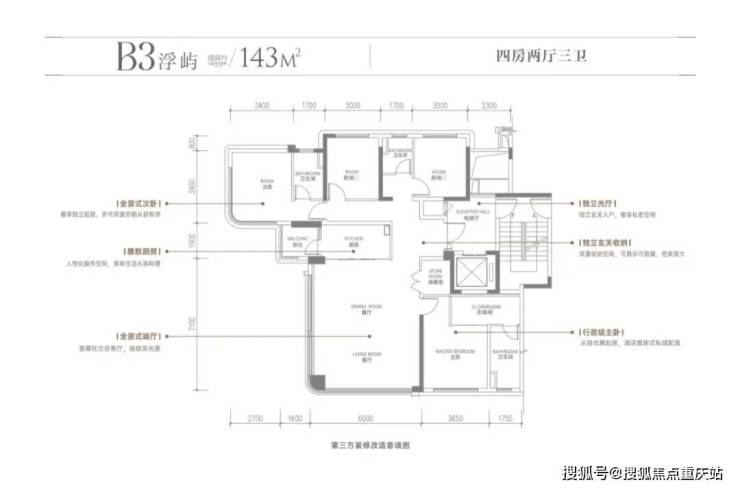高投「启鸣」系为全T2板式四房、搭配10多个平方的入户光厅的设计,且全系架空层,拥有超高得房率,户型区间为约120-143㎡。