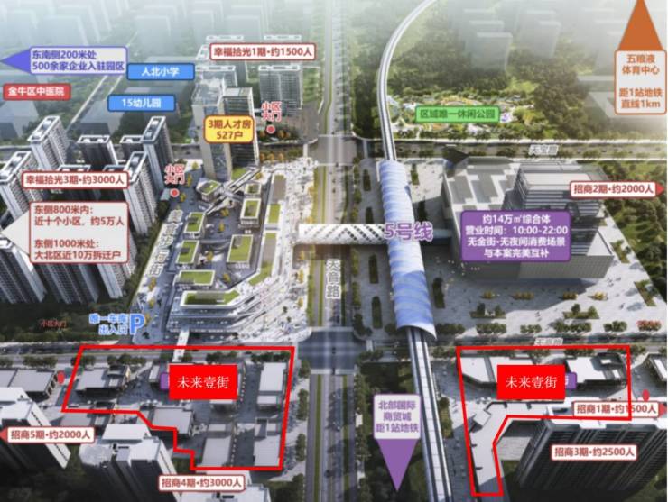 依托TOD内生外辐射优势,自带流量加持;周边约2200户社区住户、1公里内11300户住宅人群、3公里内日均10万人次客流,叠加文体中心、国际商贸年均客流,消费客群基数庞大。