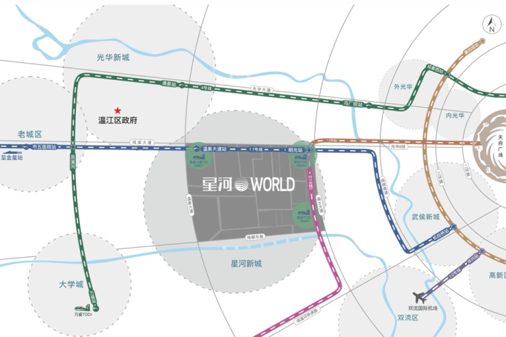 成都星河WORLD科创城位于成都市温江区,地处成都市中心城区西北部,总占地约574.8亩,总建筑面积约103万平方米,计划总投资约160亿元。项目不仅规划了高品质科创空间、生态文体公园、活力商业街区和高品质生态住区,还致力于构建一个集产业、生活、文化于一体的现代化新城。
