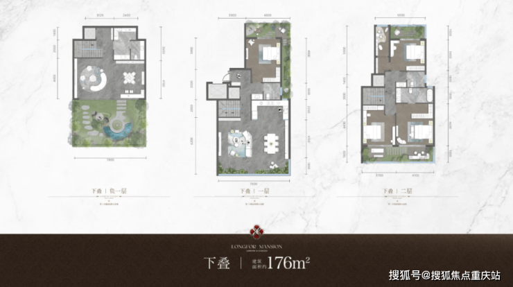 约176㎡的下叠,1+2层阳台、露台合计约47㎡,-1层户外空间占比高达约36%。