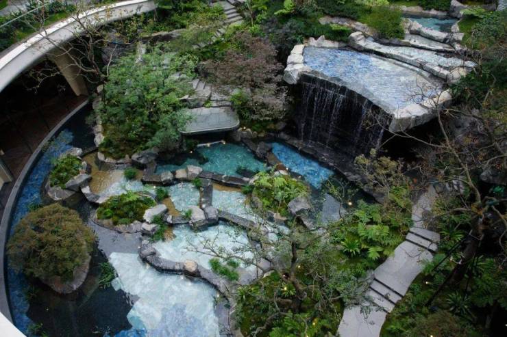 庭院以黄龙那种阶梯式瀑布递进到地面,丝滑过渡莫得明显分割显得超级天然。