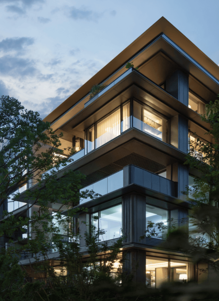项目团队突破性地将独栋别墅的“五独立体系”——独立建筑单元、独立地下室、独享庭院、独立电梯入户及花园动线——注入叠墅形态,同时借鉴大平层“面宽极限化”设计,打造出下叠边户约26.7米U型采光面、中叠/上叠约15.4米超尺度面宽,使单层使用面积直逼200㎡级大平层。这种“叠墅独栋化”的创新,让天宸上院在寸土寸金的主城区实现了“近独栋”体验。