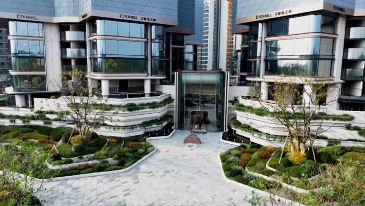它的园区采用立体抬升式景观体系,让归家动线始终保持向上,兼具隐私与仪式感。主入口不再沿道路一字铺排,而是以立体建筑体块与城市绿地融合,形成立面层次丰富的视觉界面。业主步行归家,如登上城市空中花园。