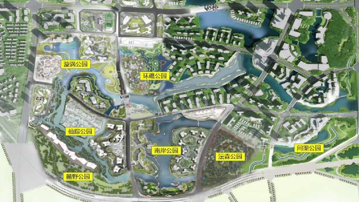 水中独岛,组团藏于双湾之中。水上独岛由一条小路分割成两个水中半岛,组团真三面临水