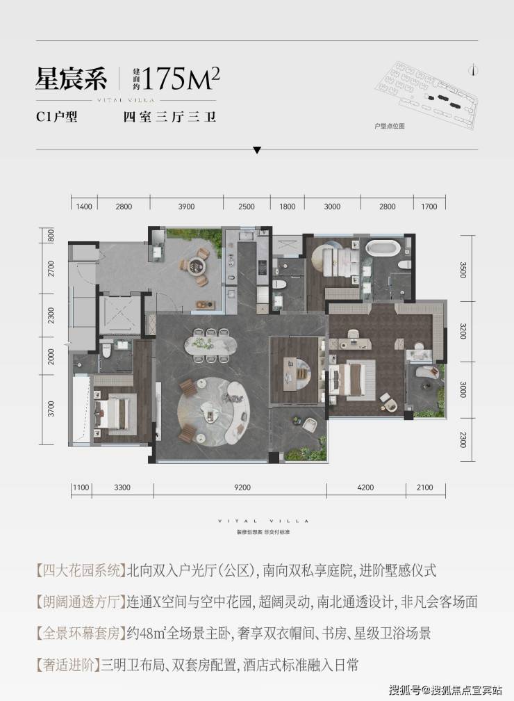 以“天空之上的森屿领地”为灵感,创造南北多花园的自然私享体系,实现前庭后院的墅感生活体验