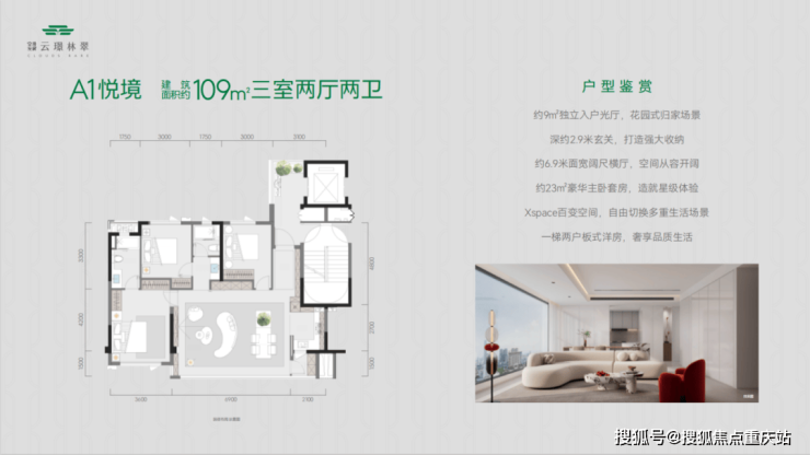 其中,建面约109㎡的悦境户型,堪称当代年轻家庭首选的刚改不二之选。其采用总高仅11层的一梯两户设计,每栋仅22户,确保了居住的私密性与纯粹性。户型内部,约8.9米奢阔观景阳台连接LDKG一体化横厅,不仅实现了空间的“零浪费”和近100%的得房率, 更创造了一个开阔、互动的家庭社交中心。此外,约9㎡的私享电梯厅、海量收纳的玄关设计以及可根据家庭需求灵活改造的“X空间”,每一处细节都体现了对现代人居需求的深刻洞察,堪称同面积段产品中的革新之作。
