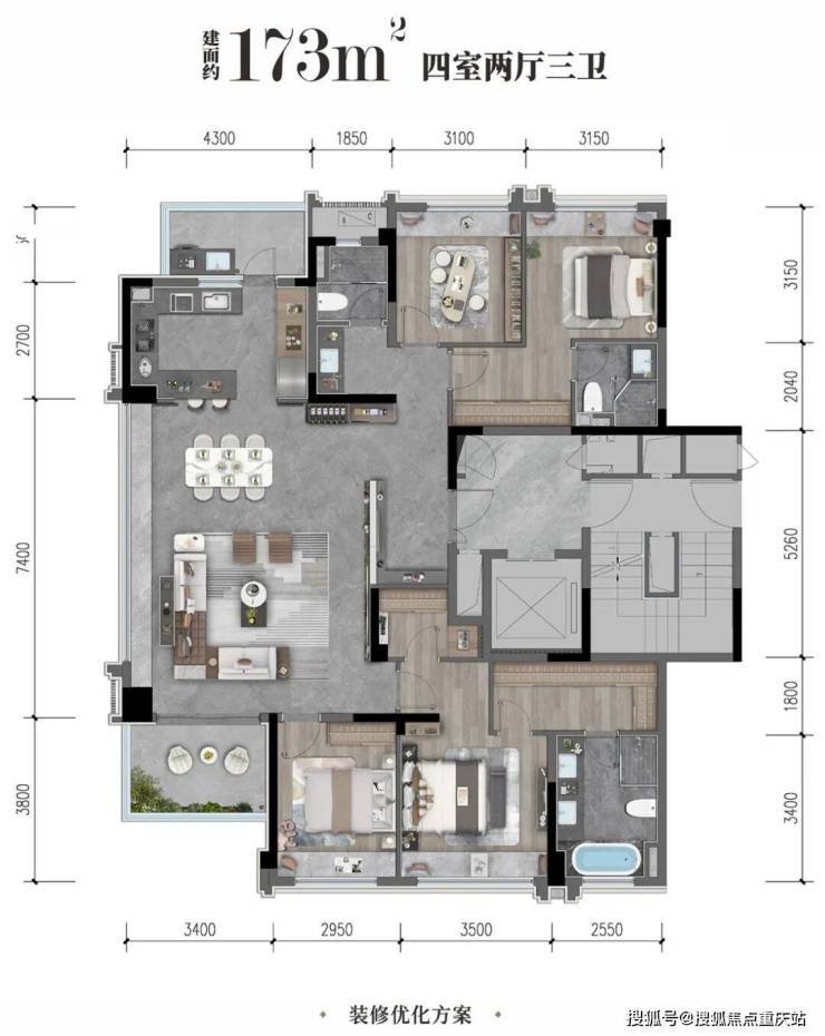 建面约173㎡是少有的三面宽幕采光设计,端厅采光面约7.4米;双套房、双阳台设计,阳台都是360°景观,动线很适合对私密性要求极高的客群,主卧双衣帽间面积达到了约34平米。