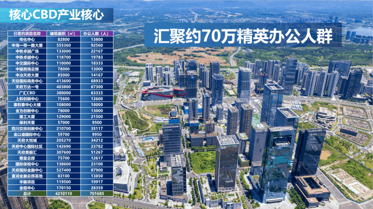 中建、中交、中铁、中粮、中电建、中海、保利、招商局、蜀道等头部央国企西南总部纷纷落子,高能级项目超 150 个。截至 2024 年,天府总部商务区总投资超 2800 亿元。其中项目所在东区汇聚企业26个(不含未签约地块),约70万精英办公人群。