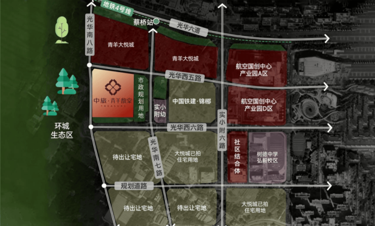 中旅·青羊馥棠,就站在这个“中芯”的正中央。作为距青羊大悦城最近的项目,坐拥三面绿地、百米双地铁的绝妙位置,步行动线即生活半径。在蔡桥大悦城板块,中旅·青羊馥棠不仅是性价比“最优解”,更是稀缺的准现房核芯资产,堪称“中芯的中芯”: