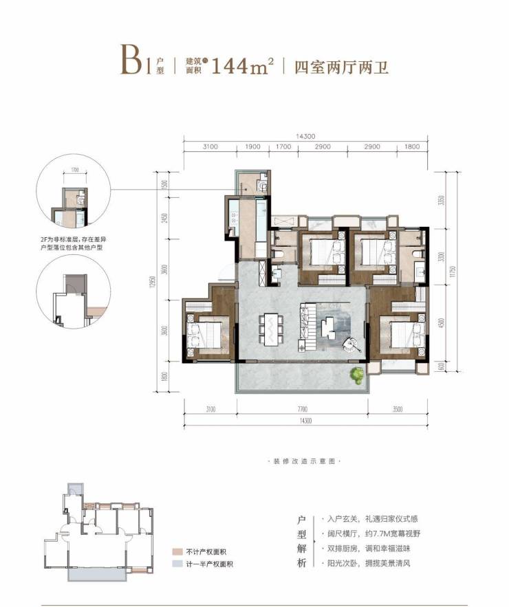 建面约144平套三