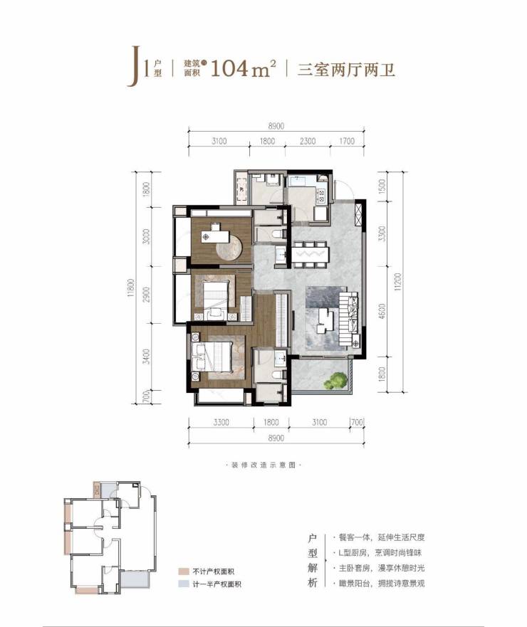 建面约104平套三