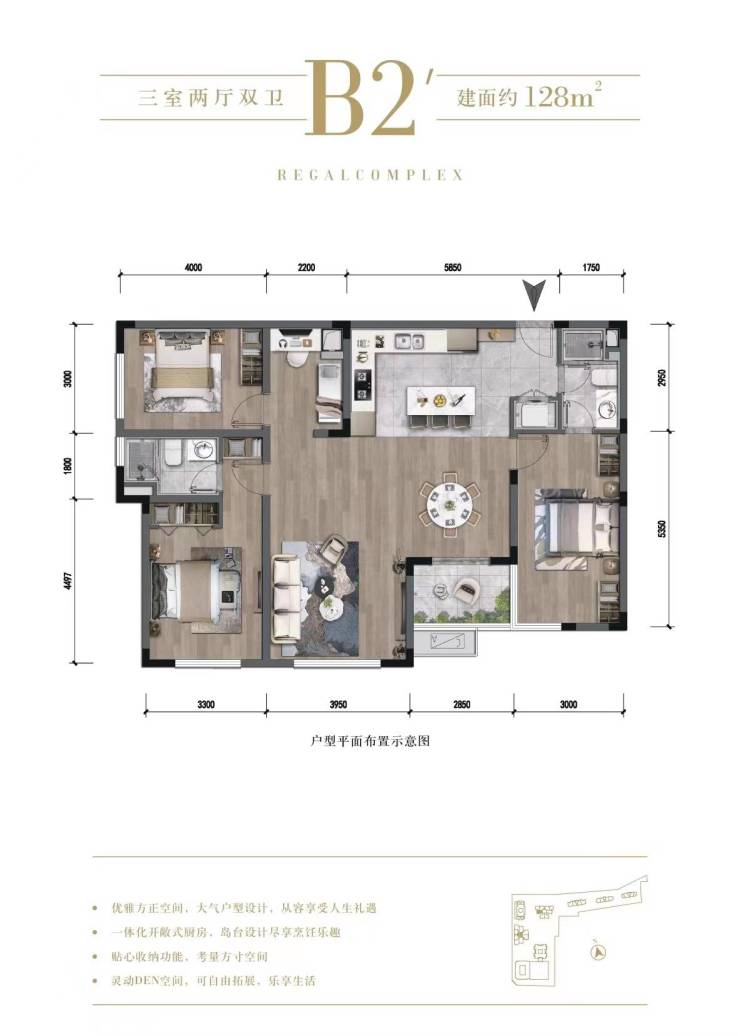 建面约128平套三