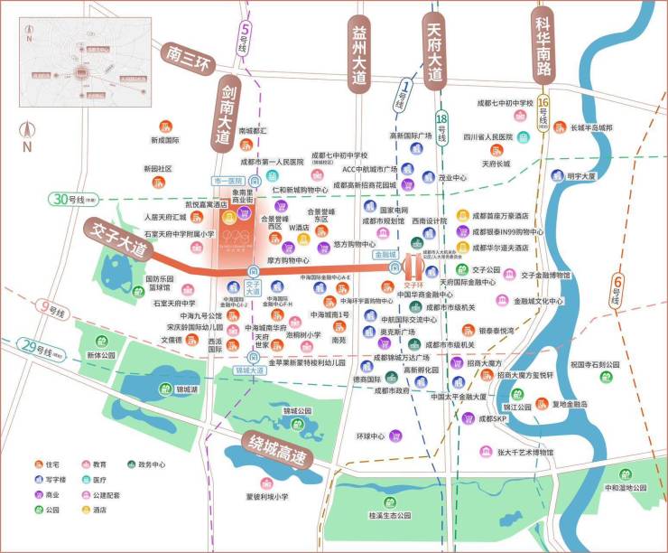 润富国际998项目坐落于成都金融城的黄金中轴线上,距离城市新地标——双子塔仅1.7公里,交通便利,地铁5号线交子大道站直接通达。这一位置不仅让居民能够轻松享受城市的繁华与便利,还确保了出行的便捷性。周边直线1公里范围内交通配套资源丰富,多条公交线路和地铁站点环伺,无论是前往市中心还是其他区域,都能轻松实现。