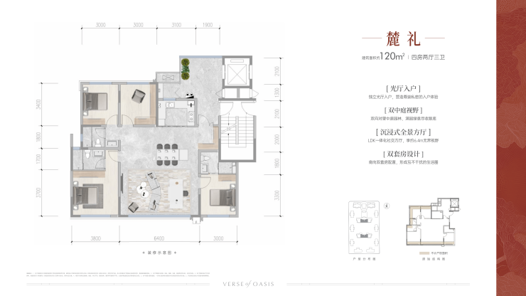 建面约120㎡,实得约135㎡四房两厅三卫,约18㎡独立光厅入户,双中庭视野-南北通透