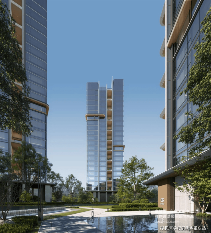 建筑立面设计采用高端定制材质,从用料上展现豪宅底蕴。主立面采用了蓝灰玻璃、浅色铝板、米色石材等材质,转角处均采用弧形设计,外立面挺拔大气不失柔和,既能融入周边环境,又在环境中脱颖而出,顶部钻石塔冠的设计也为外立面增加标识性和艺术美感。