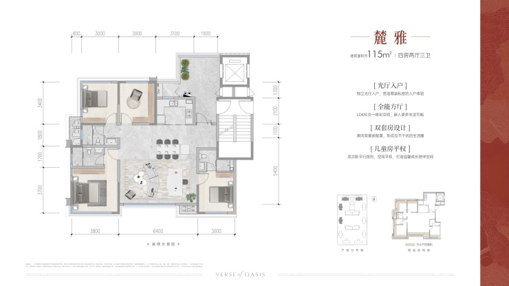 建面约115㎡,实得约131㎡四房两厅三卫,约18㎡独立光厅入户,约42㎡通透敞亮方厅,双套房设计,等面积平权儿童房