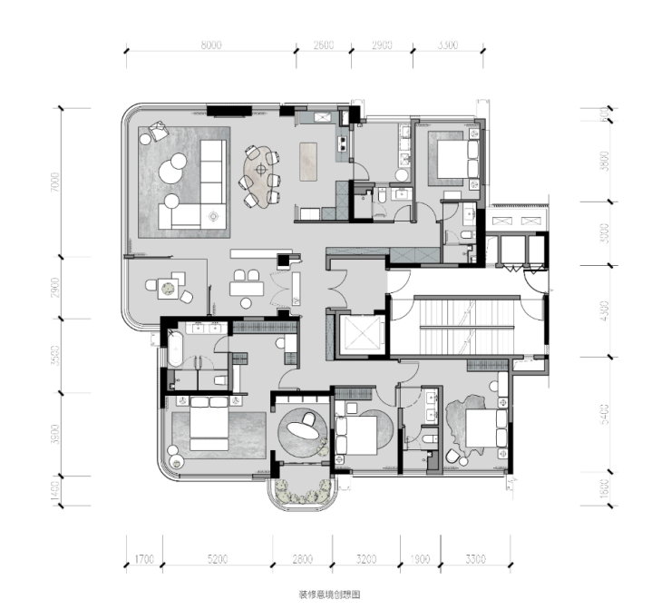 建面约253 ㎡的主卧套房是成都市场上罕见的行政级主卧——面积约57㎡,超配270°环幕视野全景舱、女王衣帽间、四分离主卫,以及独立的休息区。尤其值得一说的是主卧外的景观阳台宽约2.8米,可放置两张休闲椅,傍晚泡完澡后可在此休息,欣赏城市夜景,全成都亦实属难得一见。
