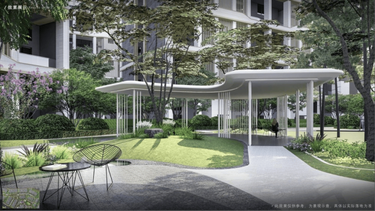 约1500㎡舒氧林下会客空间。廊下休闲+林下交流+康养植物,为业主营造健康、轻氧、乐活的生活体验。