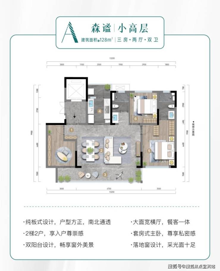 建面约128平套三