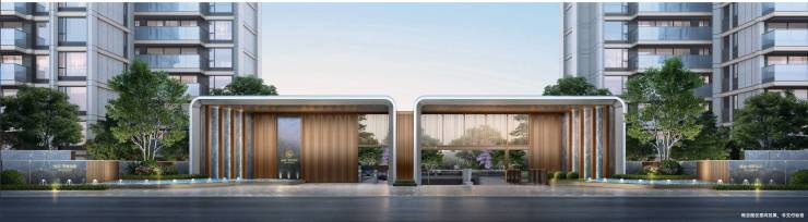 建筑立面采用米白色铝板 + 蓝灰玻璃 + 香槟金属线条,顶部双弧形设计,外观时尚大气。公区设有星级酒店式精装大堂、地下落客光厅、全石材车库等,品质感十足。