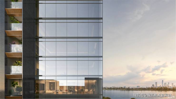▎幕墙肌理:建筑立面玻璃包裹超90%以上,天然奢石竖向装饰,打造漂浮湖面的光幕之舟。