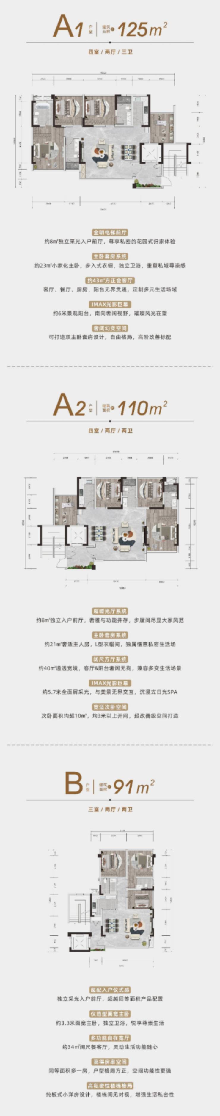 作为主城首批执行建筑新规的项目,通过纯板式结构与户型极致优化,得房率均为100+%。建面约91㎡户型即为三房两卫,约110-125㎡户型均为宽境四房。在同等建筑面积下,获得远超传统户型的可享空间,实现居住升级。